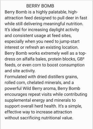 Berry Bomb is a highly palatable, high attraction feed designed to pull deer in fast while still delivering meaningful nutrition. It's ideal for increasing daylight activity and consistent usage at feed sites, especially when you need to jump start interest or refresh an existing location. Berry bomb works extremely well as a top-dress on alfalfa bales, protein blocks, GB2 feeds or even corn to boost consumption and site activity. Formulated with dried distillers grains, rolled corn, chelated minerals and a powerful wild berry aroma. Berry bomb encourages repeat visits while contributing supplemental energy and minerals to support overall herd health. It's a simple, effective way to increase attraction without sacrificing nutritional value.